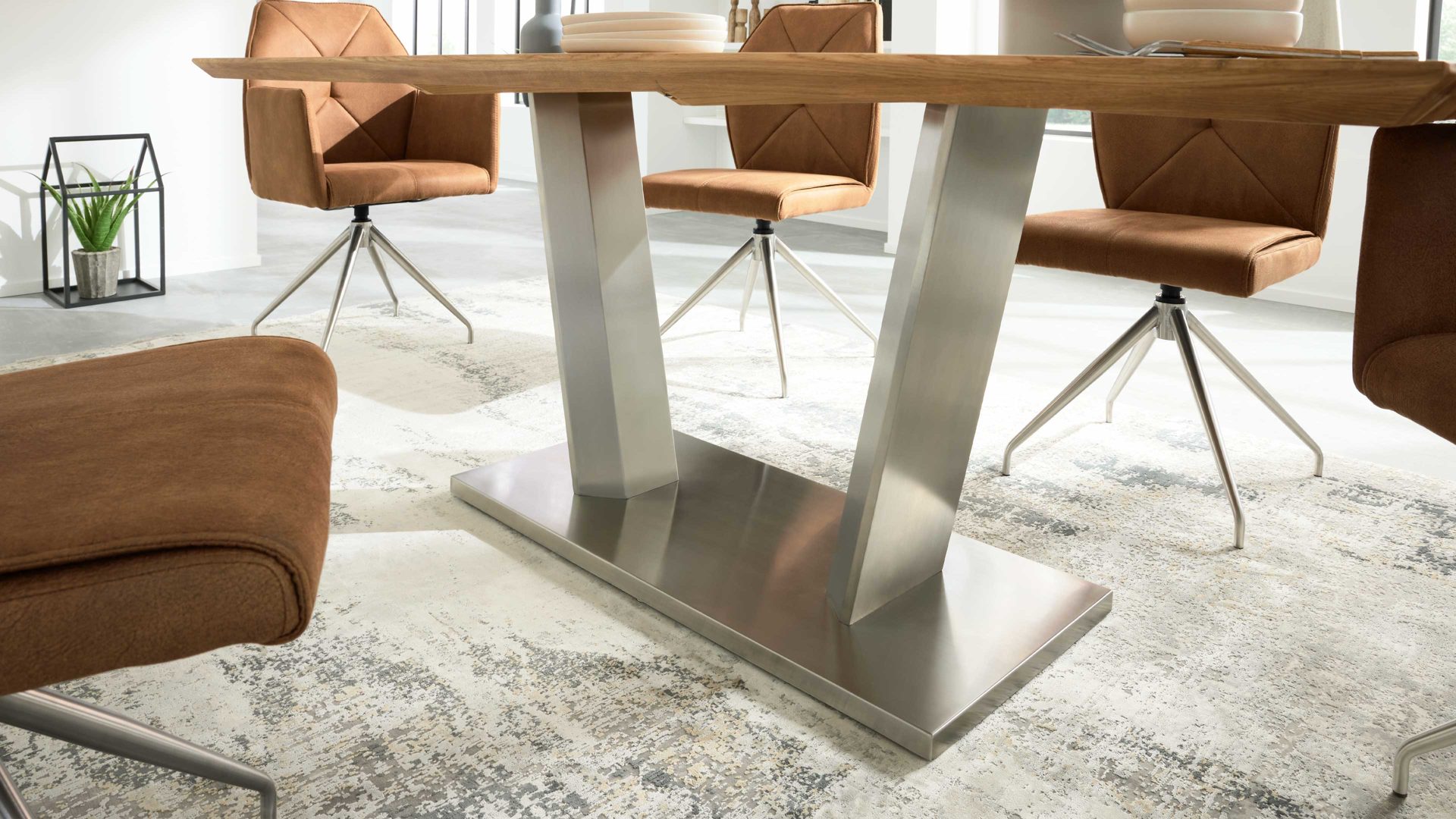 Der Esstisch aus der Interliving Esszimmer Serie 5104 kombiniert massive Wildeiche mit einem eleganten Edelstahlgestell – für ein stilvolles Zusammenspiel von Natur und moderner Formensprache. Die geölte Tischplatte bringt durch ihre lebendige Maserung warme Natürlichkeit in deinen Essbereich und schafft eine behagliche Atmosphäre. Die charakteristische Schweizer Kante verleiht dem Tisch eine filigrane Silhouette und macht ihn trotz massiver Bauweise optisch leicht.