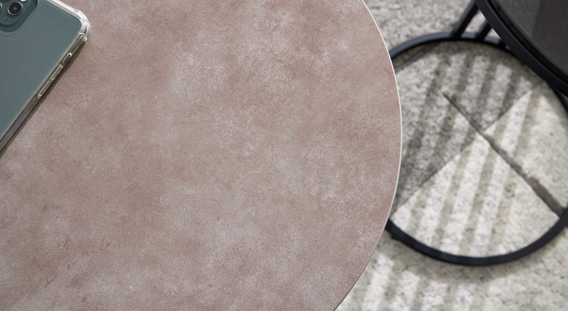 Die Kombination aus zementgrauer Keramik und schwarzem Stahl verleiht dem Tisch seinen urbanen Charme und sorgt gleichzeitig für eine elegante, klare Linienführung. Das robuste Gestell garantiert Stabilität, während die glatte, pflegeleichte Oberfläche der Tischplatte den modernen Look perfekt abrundet.