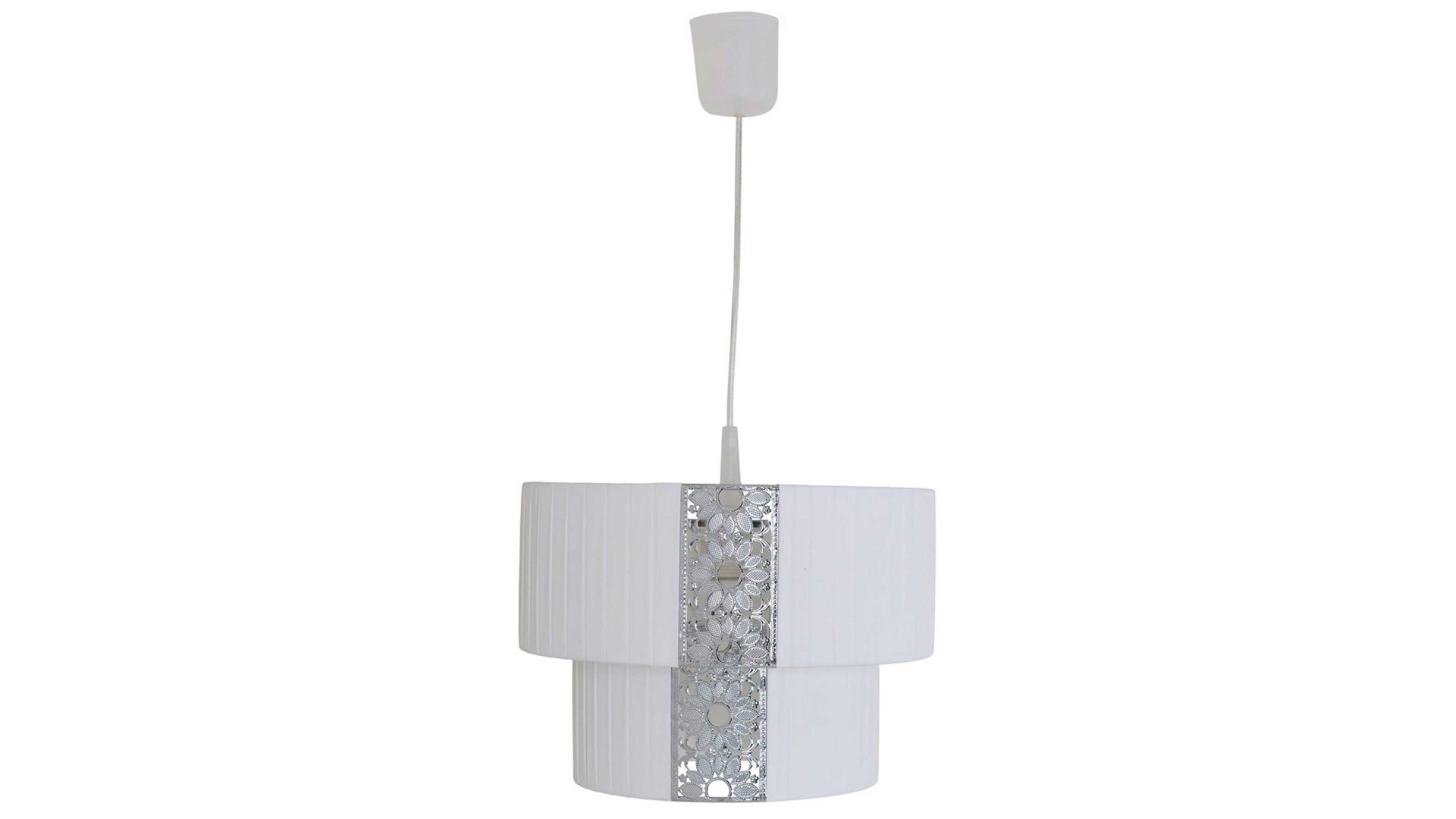 Sie überzeugt mit ihrem gefalteten weißen Stoff-Lampenschirm, dessen edle florale Applikationen im attraktiven Farbton Silber ganz klar die optischen Highlights bilden.
