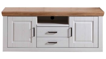 - Das ca. 158 x 63 x 52 cm (BxHxT) große Lowboard bietet zwei Türen mit jeweils einem Holzboden, zwei Schubladen und ein offenes Fach mit praktischem Kabeldurchlass. Alle Elemente sind symmetrisch angeordnet, was dem Auge schmeichelt und der gesamten Wohnwand Struktur gibt.