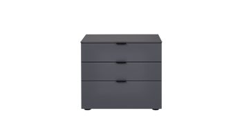 Mit ihren kreidegrauen Mattlackoberflächen verkörpert die Nachtkommode Bonnie moderne Eleganz. Schwarze Metallgriffe und schlichte, praktisch höhenverstellbare Möbelgleiter runden das stilvolle Design harmonisch ab. Zu den qualitativen Höhepunkten gehören überdies die widerstandsfähigen abgerundeten Dickkanten.
