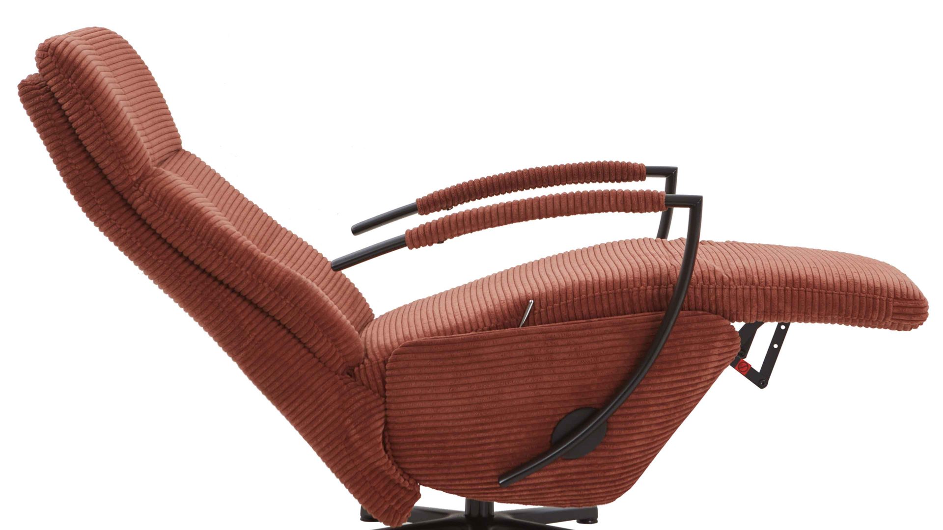 Relax-Drehsessel mit bequemer PUR-Schaumpolsterung und mattschwarzen Metall-Armlehnen mit Polsterauflagen