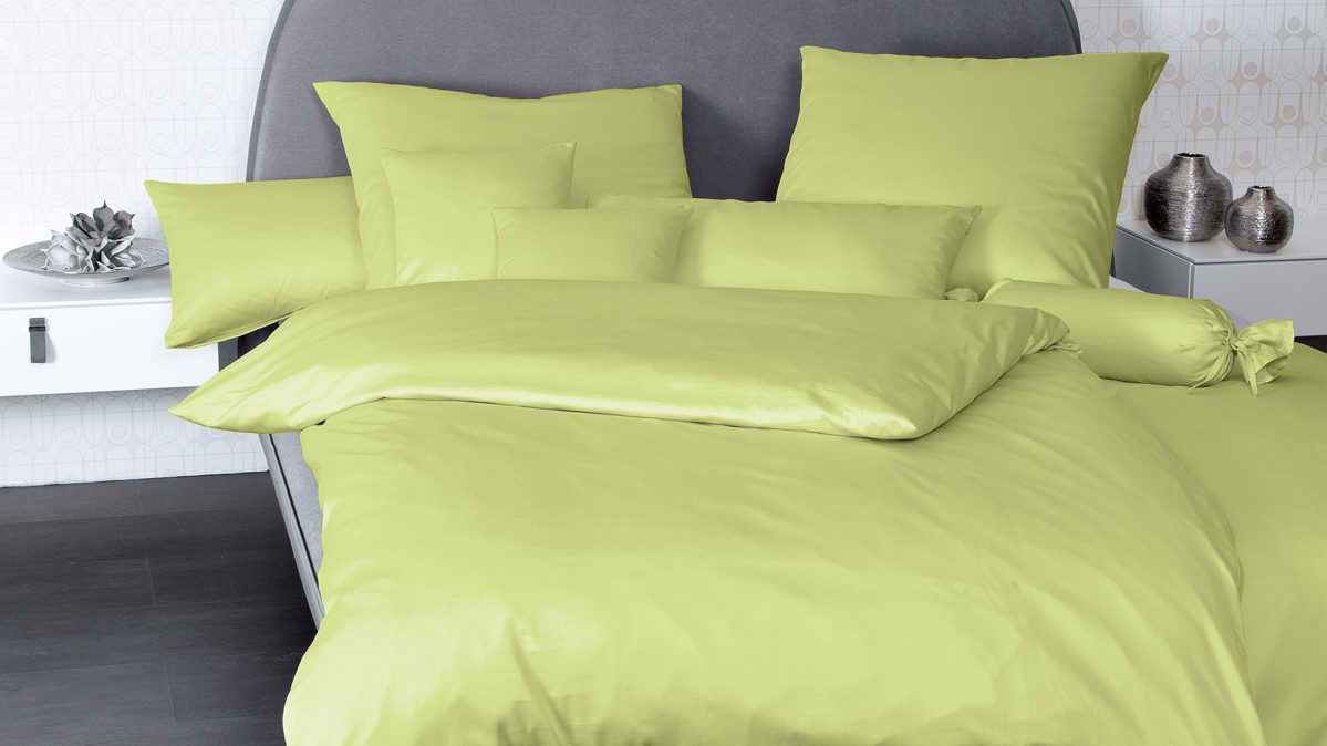 Das Modell Colors 31001 von der Marke Janine® aus geschmeidigem Mako-Satin in Apfelgrün in der Größe ca. 200 x 200 cm und zwei Kissenbezüge ca. 80 x 80 cm. Mako-Satin von Janine ist aus 100% naturreiner Mako-Baumwolle gefertigt. Dank der Mercerisierung, einem speziellen Veredlungsprozess für Baumwolle, erhält der Bettbezug ein samtiges Glanzfinish, das nicht nur das Dessin unterstreicht, sondern auch angenehm leicht und weich auf der Haut anliegt. Dazu ist die Janine-Satinbettwäsche äußerst pflegeleicht. Die Bettwäsche ist bis 60 Grad waschbar und trocknergeeignet. Des Weiteren ist in den Bettbezug ein Reißverschluss eingearbeitet, mit dem Sie die Bettzeuggarnitur einfach mit einem Zip wieder aufziehen können.
