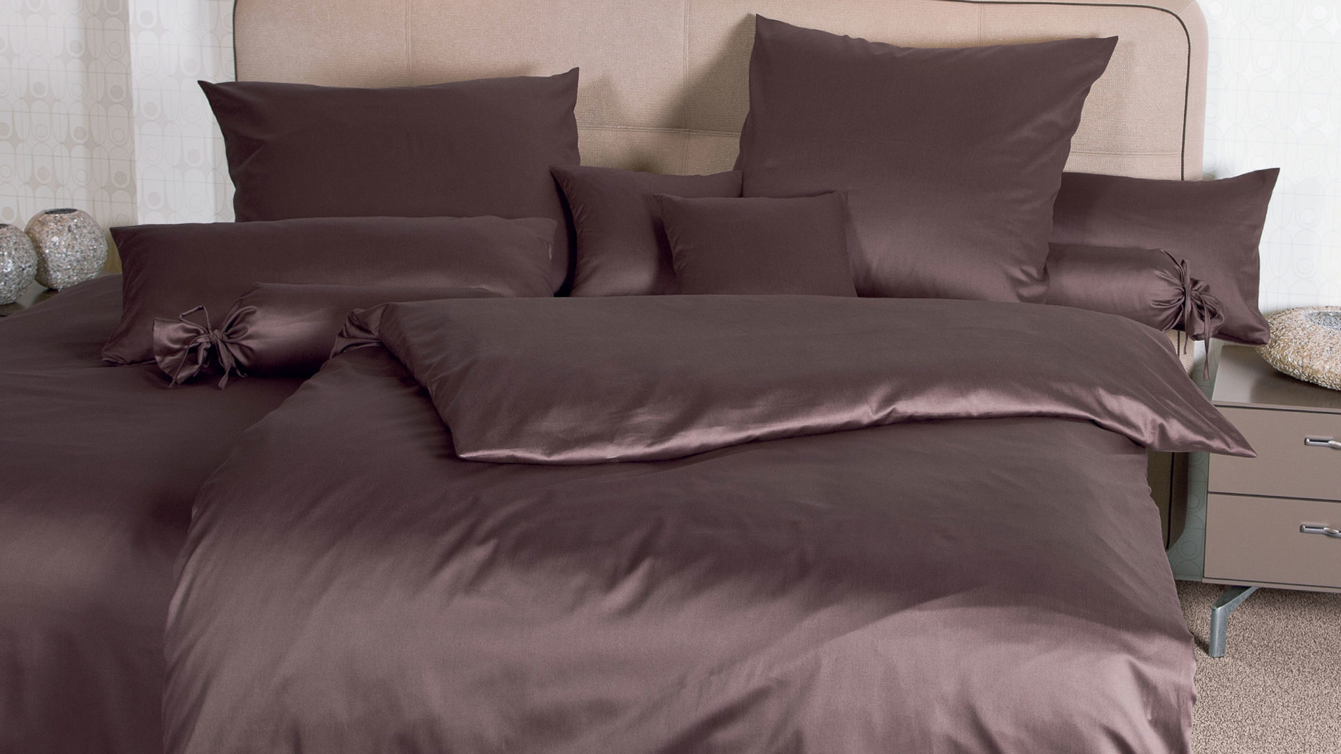 Das Modell Colors 31001 von der Marke Janine® aus geschmeidigem Mako-Satin in schokofarben in der Größe ca. 240 x 220 cm und zwei Kissenbezüge ca. 80 x 80 cm. Mako-Satin von Janine ist aus 100% naturreiner Mako-Baumwolle gefertigt. Dank der Mercerisierung, einem speziellen Veredlungsprozess für Baumwolle, erhält der Bettbezug ein samtiges Glanzfinish, das nicht nur das Dessin unterstreicht, sondern auch angenehm leicht und weich auf der Haut anliegt. Dazu ist die Janine-Satinbettwäsche äußerst pflegeleicht. Die Bettwäsche ist bis 60 Grad waschbar und trocknergeeignet. Des Weiteren ist in den Bettbezug ein Reißverschluss eingearbeitet, mit dem Sie die Bettzeuggarnitur einfach mit einem Zip wieder aufziehen können.