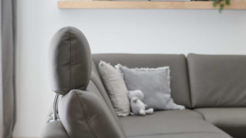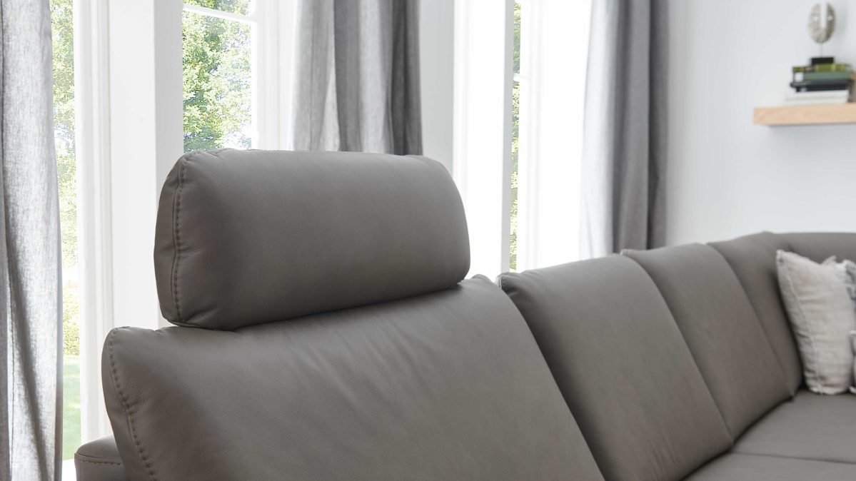 die Kopfstütze wird in die Kopfstützvorrichtung an der Rückenlehne des Sofas eingesteckt und lässt sich dann in der Höhe und in der Neigung manuell verstellen