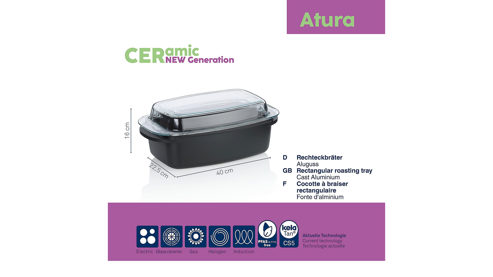 Entdecken Sie den vielseitigen Atura Bräter aus Aluguss, der mit einem Fassungsvermögen von 4,5 Litern ideal für die Zubereitung von Schmorgerichten und Braten ist. Der hitzebeständige Glasdeckel bietet nicht nur eine klare Sicht auf Ihre Speisen, sondern kann auch als separate Auflaufform genutzt werden. Die robuste Aluguss-Konstruktion sorgt für eine gleichmäßige Hitzeverteilung, während der induktionsfähige Allherd-Boden Ihnen maximale Flexibilität auf allen Herdarten ermöglicht. Die pflegeleichte Keramikbeschichtung macht die Reinigung besonders einfach. Dieser Bräter ist eine praktische und vielseitige Ergänzung für Ihre Küche. Maße ca. 23 x 16 x 40 cm (BxHxL)
