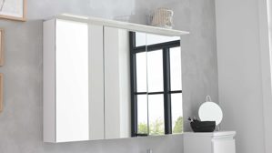 Der dreitürige Spiegelschrank rundet das Set perfekt ab. Drei doppelseitig verspiegelte Holztüren und sechs höhenverstellbare Glasböden sorgen für Ordnung und Flexibilität. Das integrierte Steckdosen-Schalterelement auf der linken Seite ist ideal für Rasierer, Föhn oder elektrische Zahnbürsten. Ein 30-Watt-LED-Converter ist bereits enthalten und lässt sich mit einer passenden LED-Flächenleuchte kombinieren.
