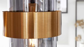 Die Hängeleuchte Interliving Leuchten Serie 9333 vereint moderne Eleganz mit einem Hauch Extravaganz und setzt deinen Essbereich eindrucksvoll in Szene. Die Kombination aus einer klassisch mattschwarzen Metallbasis und vier rauchfarbenen Glasschirmen, die von gebürsteten messingfarbenen Metallringen umrahmt werden, schafft ein stilvolles Gesamtbild. So entsteht ein harmonisches Zusammenspiel aus kühlem Metall und warmen Akzenten – ideal für ein wohnliches Lichtambiente mit Charakter.