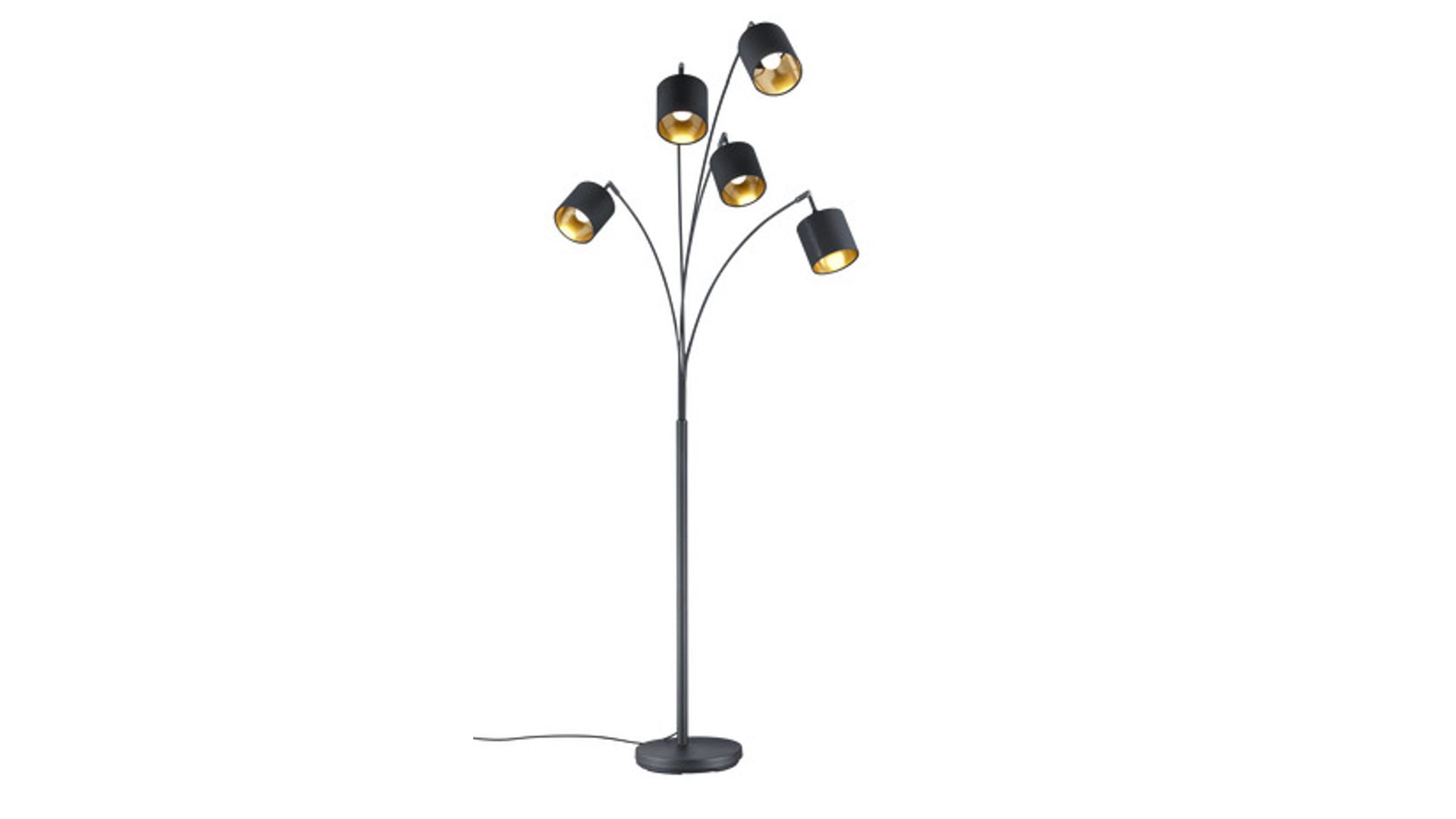 Sie kombiniert ein robustes Gestell aus mattschwarzem Metall mit fünf Lampenschirmen, die außen mit schwarzem Stoff bezogen und innen goldfarben beschichtet sind. Durch die stilvolle Farbkombination mutet die Standlampe geradezu nobel an.