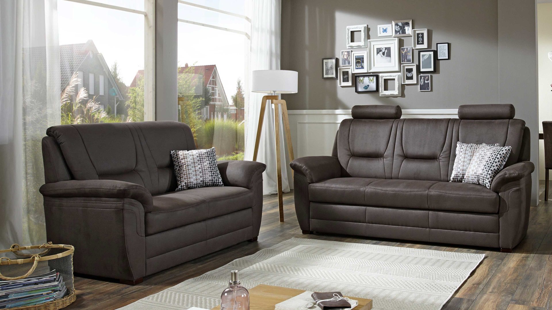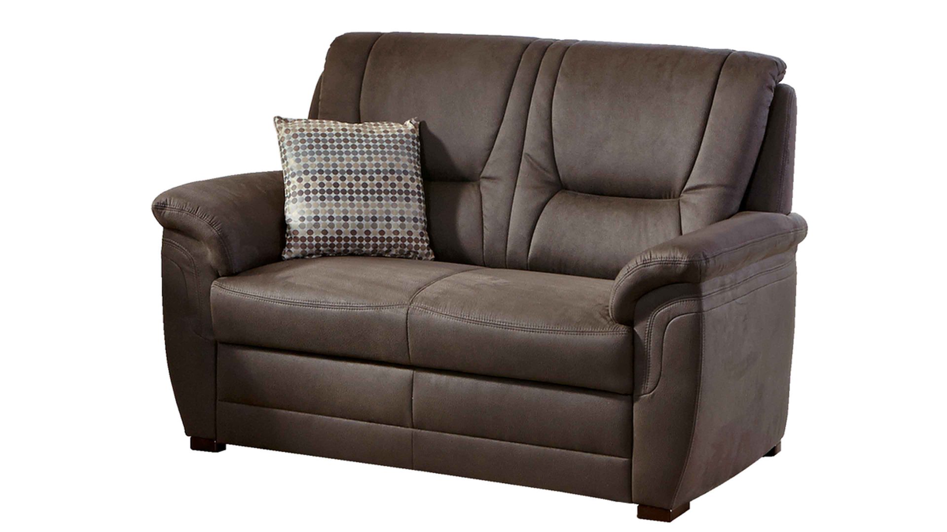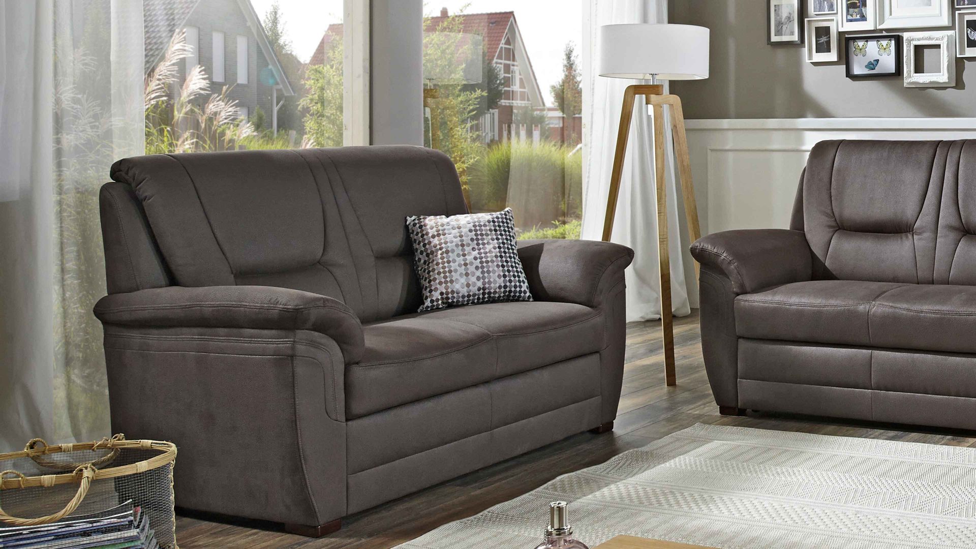 Die zweiteilige Polstergarnitur aus dem Modulmaster-Programm MM-PP1013 setzt sich aus einem Drei- und einem Zweisitzer zusammen. Beide Sofas sind mit einem edlen nougatfarbenen Mikrofaserbezug und antikfarbenen Holzfüßen versehen. Sie strahlen moderne Eleganz mit natürlichem Charme aus.