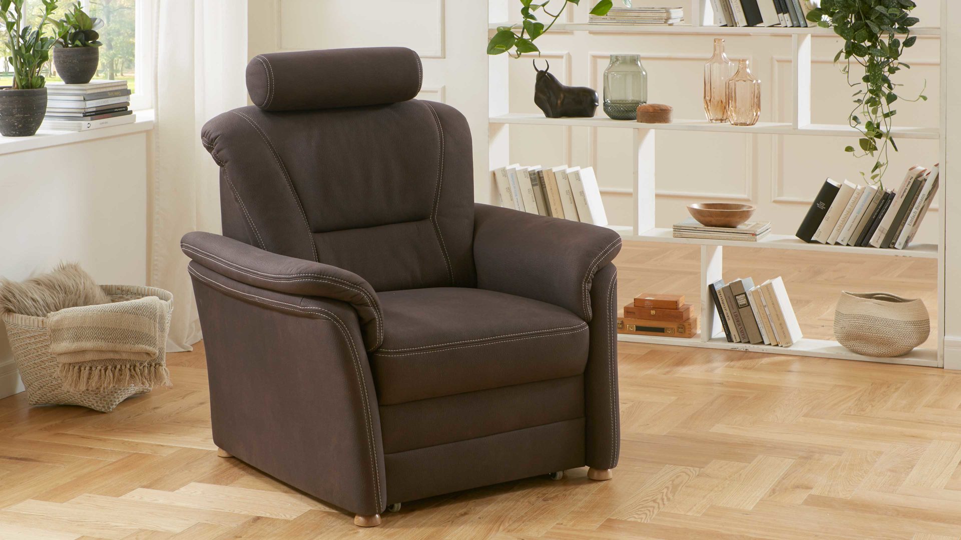 Der schokobraune Mikrofaserbezug mit beiger Kontrastnaht und die biancofarbenen Eichenholzfüße harmonieren hervorragend miteinander und sorgen für eine warme Atmosphäre im Lesezimmer oder Wohnbereich. Der Rücken des ca. 101 x 96 x 92 cm (BxHxT) großen Polstermöbels ist stoffbezogen, weshalb es sich unter anderem als Hingucker mitten im Raum bewährt.