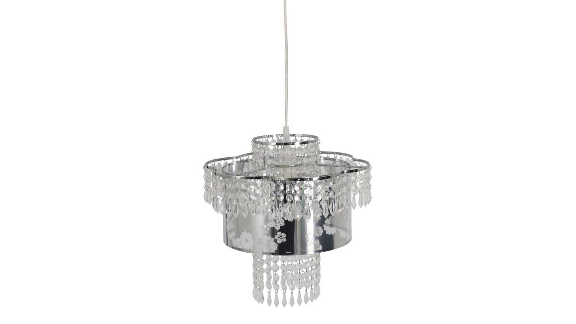 Sie offenbart einen chromfarbenen Metall-Lampenschirm mit floralem Muster und ein Gehänge aus Acrylglas, das zweifelsohne als optisches Highlight fungiert. Alles in allem präsentiert sich die Hängelampe außergewöhnlich komponiert. Durch die ausgeprägte Eleganz setzt sie in jedem Raum einen noblen Akzent.