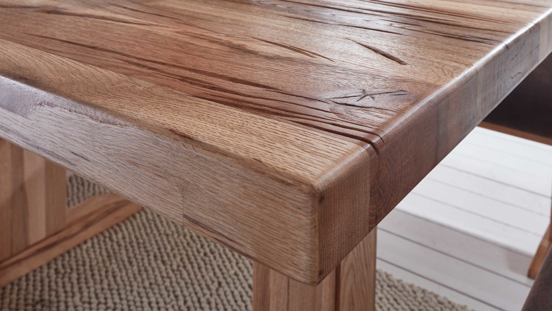 Er besteht aus strukturgehobelter Balkeneiche, die eine naturfarbene Wachseffekt-Oberfläche aufweist. Balkeneiche verleiht diesem Esszimmermöbel ein rustikales Flair. Der ca. 140 x 76 x 90 cm (LxHxT) große Massivholztisch fügt sich nahtlos in jedes Einrichtungskonzept ein.