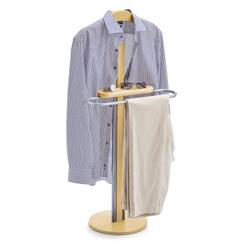 Dieser Herrendiener kombiniert buchefarbenes MDF mit trendigem aluminiumfarbenem Metall.