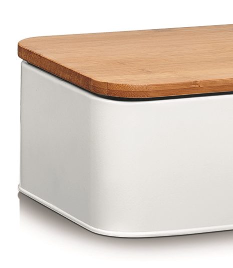 Der weiße Korpus aus pulverbeschichtetem Metall harmoniert wundervoll mit dem natürlichen Bambusdeckel. Die Maße von ca. 31 x 13 x 18 cm (LxHxT) ergänzen sowohl kleine Pantry-Küchen, Einbauküchen als auch großzügige Ausführungen mit Kochinsel. Für eine optimale Atmosphäre für lang anhaltende Frische Ihrer Backwaren sorgt die Rückseite mit Lüftungslöchern.