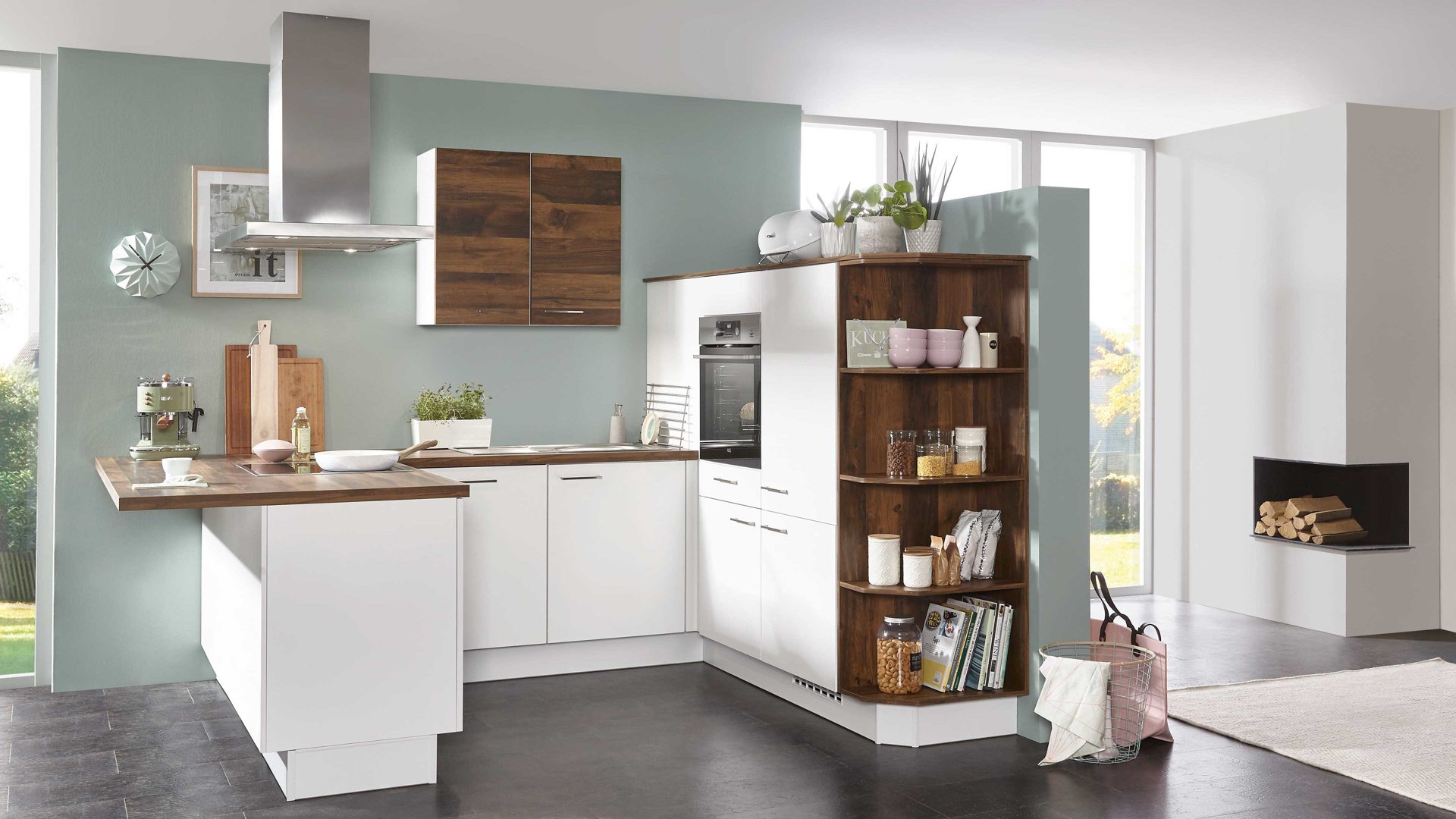 Die Kochinsel mit ansprechender Ansetztheke hat eine Stellfläche von ca. 235 x 218 cm (von links nach rechts) und Schenkelmaße von ca. 185 x 235 x 218 cm (TxLxT, von links nach rechts). Dank der Vielzahl an Schränken mit Türen und Schubladen sowie der offenen Regalbereiche bietet die Einbauküche jede Menge Stauraum für Geschirr und Lebensmittel sowie diverse Küchenutensilien.