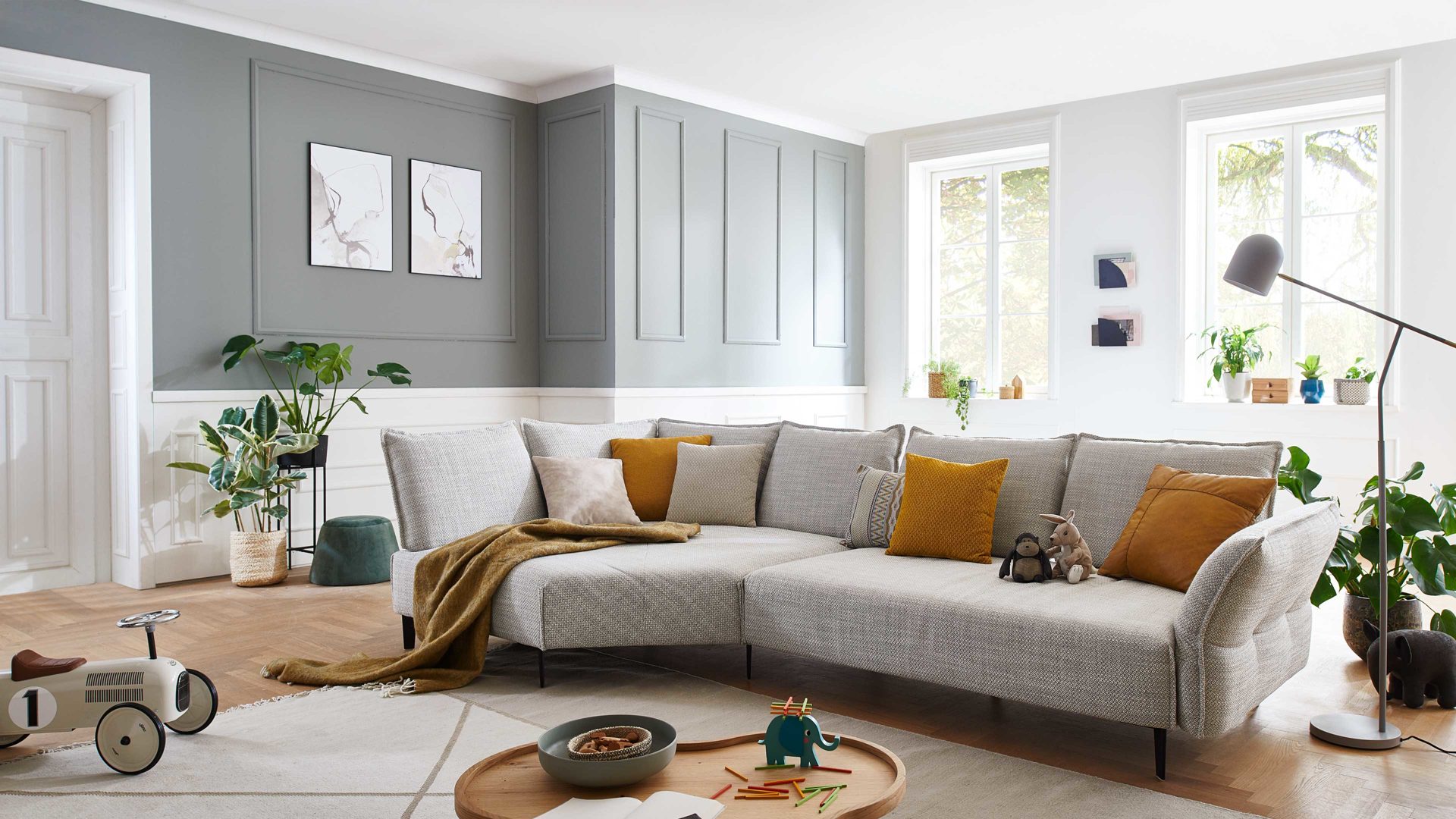 Bei diesem Modell handelt es sich um eine zweiteilige Eckkombination, die sich aus einer Kuschelecke und einem großen Sofa mit Armlehne rechts zusammensetzt. Das Sofaelement ist mit einer einfach zu bedienenden Sitztiefenverstellung für ein Plus an Komfort ausgestattet.