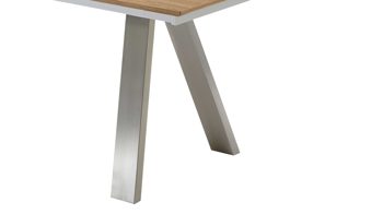 Der hochwertig verarbeitete VENJAKOB Esstisch ET159 Made in Germany kombiniert ein edelstahlfarbenes Metallgestell mit einer Tischplatte aus hell rustico geöltem Eichenholzfunier. Während das Gestell für die nötige Stabilität sorgt, bringt die Tischplatte durch die überaus gelungene Holznachbildung natürliches Flair in die Küche oder das Esszimmer. Im Ganzen strahlt der Holzplattentisch moderne Eleganz aus, die mit den verschiedensten Einrichtungskonzepten bestens harmoniert.