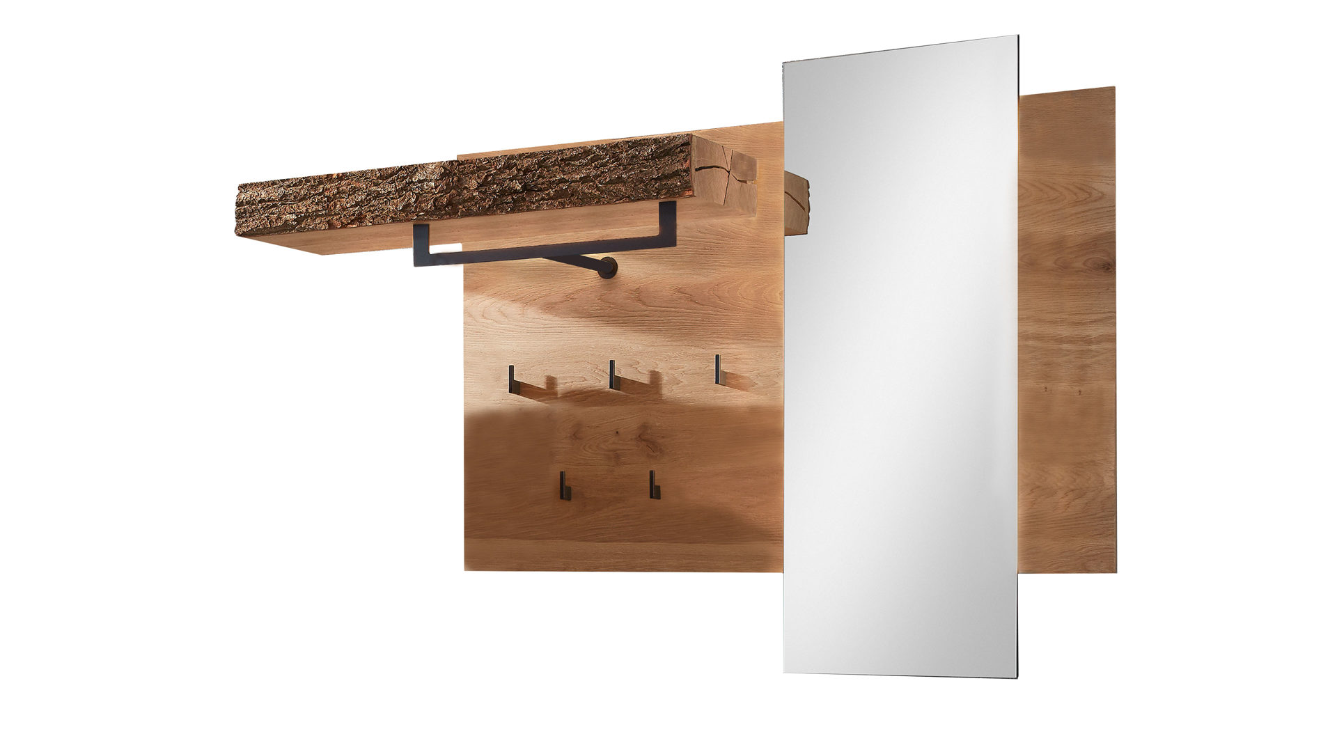 Der klappbare Mantelhaken aus Metall und die vier ebenfalls metallenen Kleiderhaken wirken kontrastierend, fügen sich aber dennoch harmonisch ins Gesamtbild ein. Sie dienen als Aufhängungen für Jacken, Mäntel und Accessoires. Die Maße der speziellen, absolut faszinierenden Wandgarderobe betragen ca. 20 x 174 x 8 cm (BxHxT). Ergänzend steht gegen Mehrpreis eine akzentuierende Beleuchtung zur Verfügung.