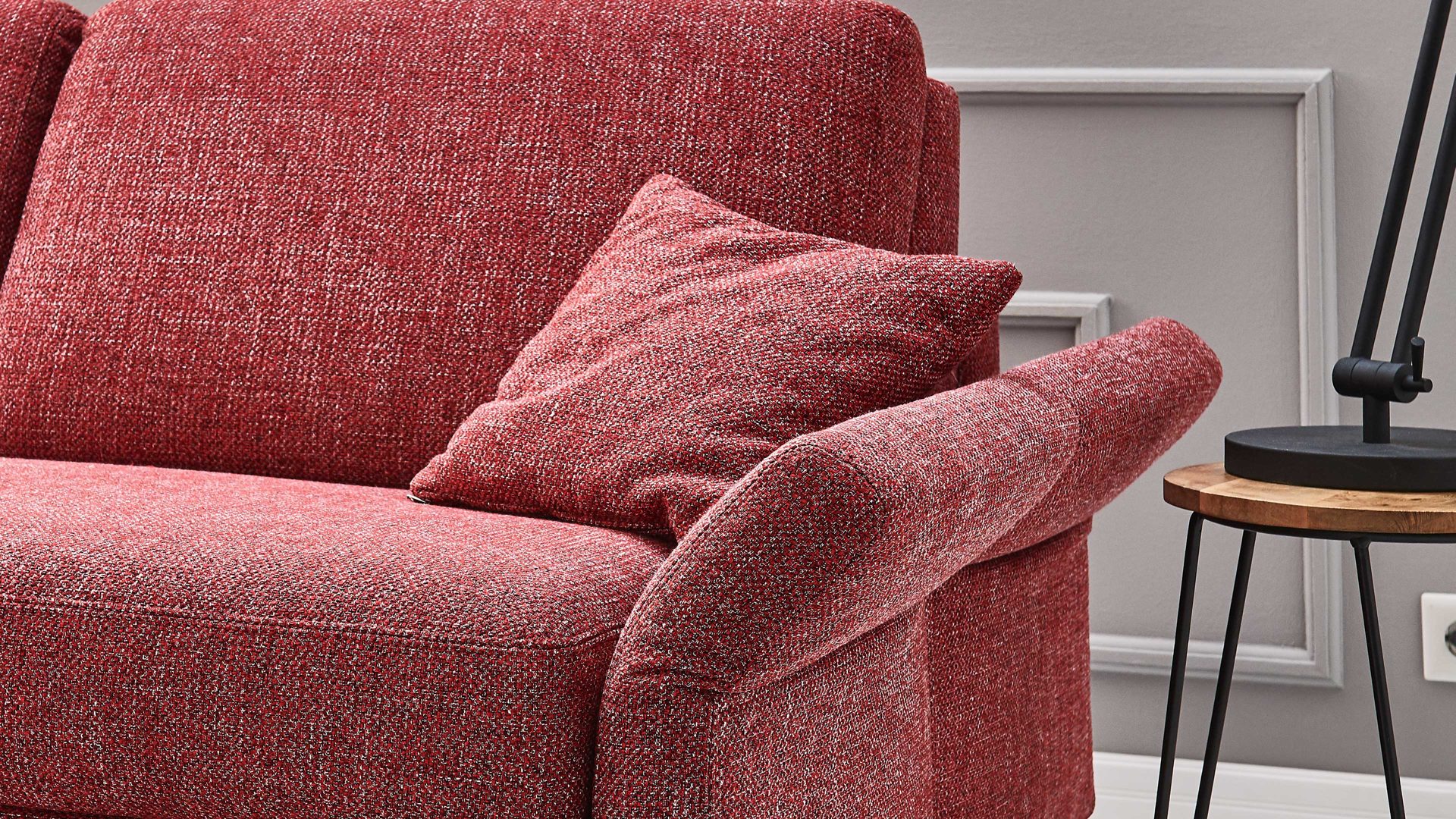 Mittels Rasterbeschlag lässt sich die Armlehne mehrfach verstellen und bis in die Waagerechte abklappen. Dadurch kann sie flexibel genutzt werden. Leicht geneigt ist sie eine bequeme Kopfstütze, wenn Sie zwischendurch ein Nickerchen auf der Couch einlegen möchten. In der waagerechten Position verlängert sie das Sofa - ideal zum Ausstrecken.