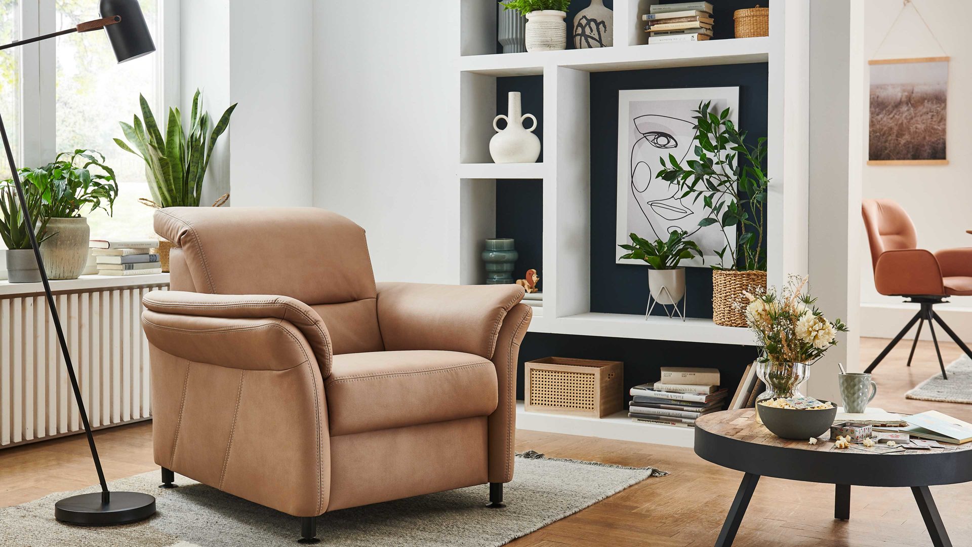 Der Sessel aus dem edlen Modulmaster Programm MM-ZE1148 kombiniert den camelfarbenen Mikrofaserbezug Galero mit einer beigefarbenen Doppel-Kontrastnaht und strahlt moderne Eleganz mit warmem Charme aus. Stilvoll abgerundet wird der Polstersessel durch die puristisch mattschwarzen Metallfüße Z002-M01. Die Rückseite ist serienmäßig im Originalstoff bezogen, was die Hochwertigkeit der Optik noch einmal verstärkt.