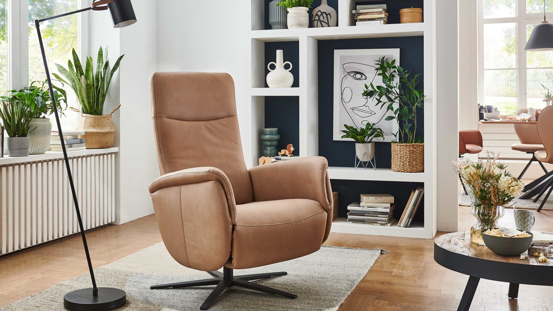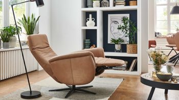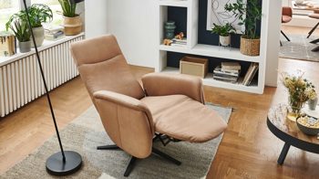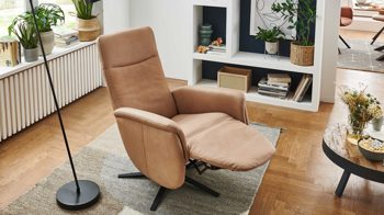 Indem Sie leichten Körperdruck ausüben, senken Sie den Rücken. In der Folge geht der Sitz automatisch nach vorn und oben. Gleichzeitig fährt die Beinauflage nach oben, bis die entspannende Relaxposition erreicht ist. Zu den funktionalen Höhepunkten gehört überdies die stufenlose Kopfpolsterverstellung. Zudem ist der Fernsehsessel um 360 Grad drehbar.