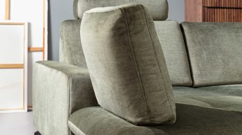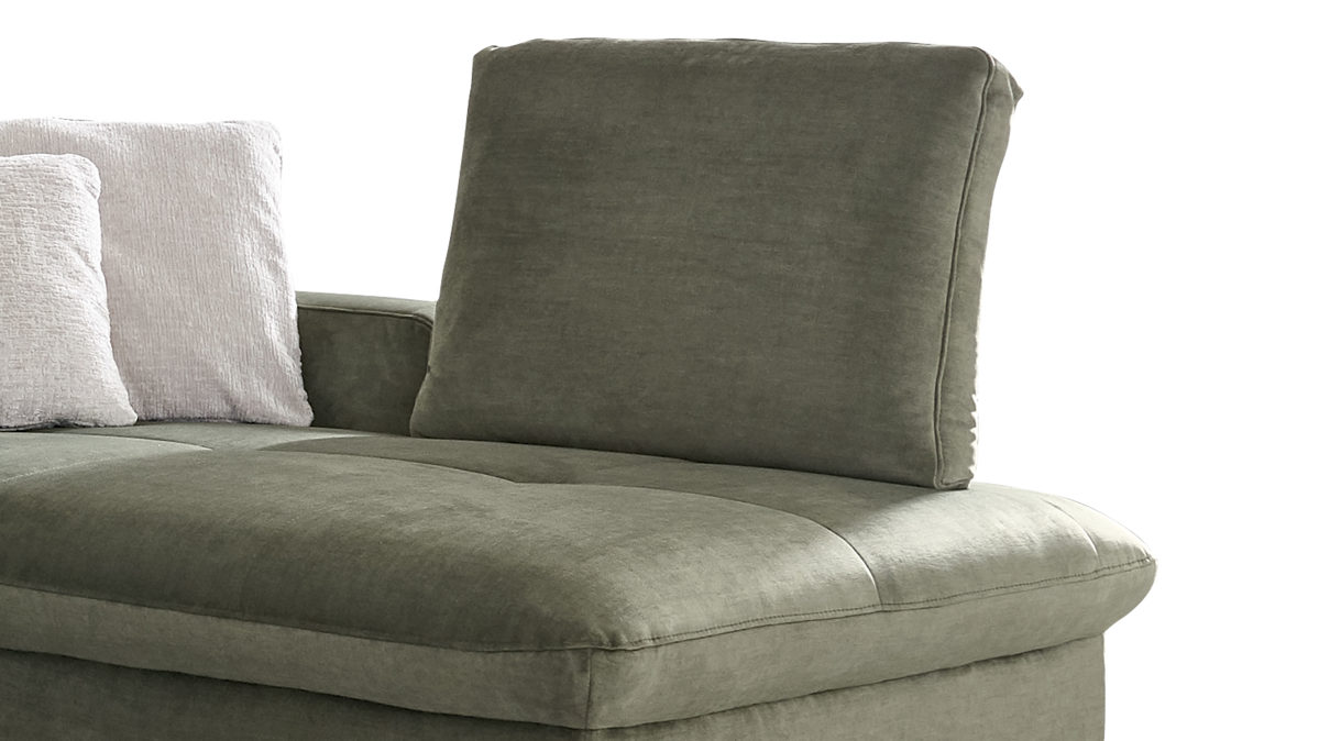 Mit weichem Kaltschaum gepolstert und trendig-olivfarbenem Mikrovelours bezogen, gewährleistet der Steckrücken die gewünschte Bequemlichkeit und harmoniert perfekt mit den Polstermöbeln im gleichen Design. Das Steckelement besteht aus robustem verchromten Metall.