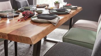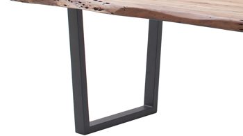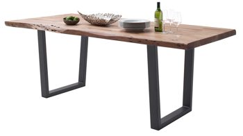 Dieser Esstisch beeindruckt in erster Linie mit seinem außergewöhnlichen Look und der exzellenten Material- und Verarbeitungsqualität. Er kombiniert eine Tischplatte aus lackiertem, zu 100 % FSC(R)-zertifizierten Akazienholz mit einem markanten Trapezgestell aus anthrazitfarben lackiertem Metall. Den optischen Höhepunkt bildet die Baumkante der 55 mm starken Tischplatte. Sie verleiht dem Tisch das gewisse Etwas und bringt ein wunderschönes Stück Natur in Ihr Zuhause.