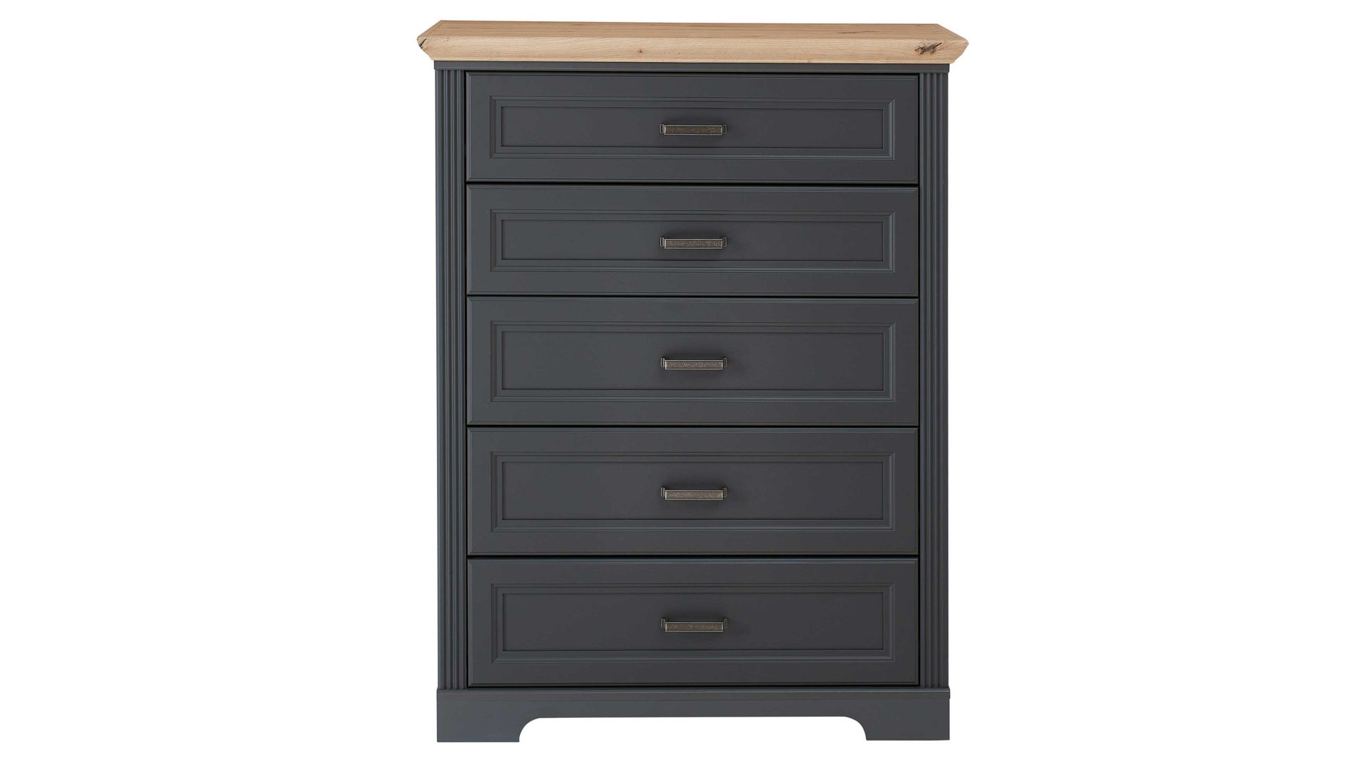 Die Schubladenkommode ist im angesagten Landhausstil designt. Front und Korpus sind in edlem Graphit gehalten, während sich der Oberboden in Artisan-Eiche-Nachbildung präsentiert. Durch die gelungene Farbkombination strahlt die Kommode hochwertige Eleganz aus. Für das gewisse Etwas sorgen die antikfarbenen Metall-Muschelgriffe. Wiederum graphitfarbene Füße runden den Look harmonisch ab.