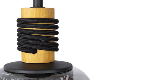 die Fassung ist in naturfarbenes Holz eingelassen, die mit schwarzem Textilkabel umwickelt ist