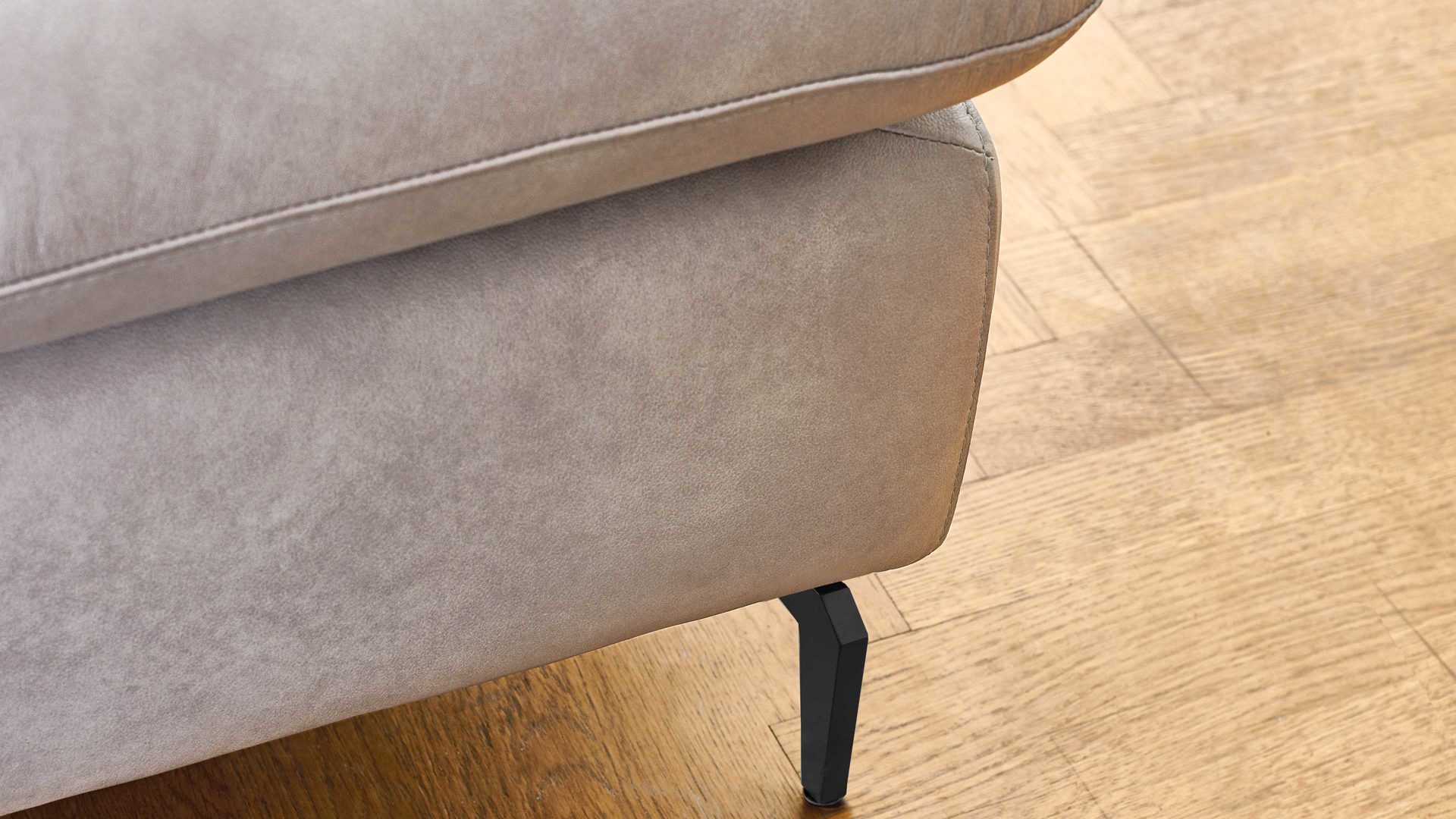 Das Ecksofa aus der W.SCHILLIG Polsterserie Select Venus plus kombiniert einen edlen hellgrauen Lederbezug mit mattschwarz pulverbeschichteten Metallfüßen.