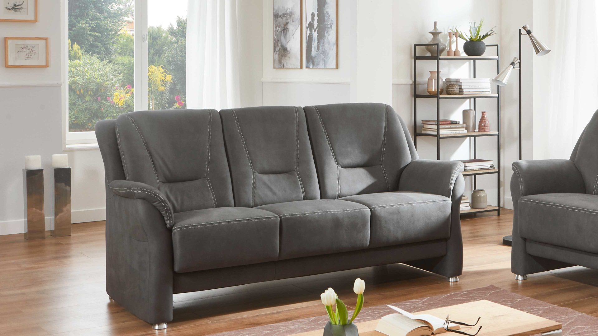 grauer Mikrofaserbezug mit beiger Kontrastnaht