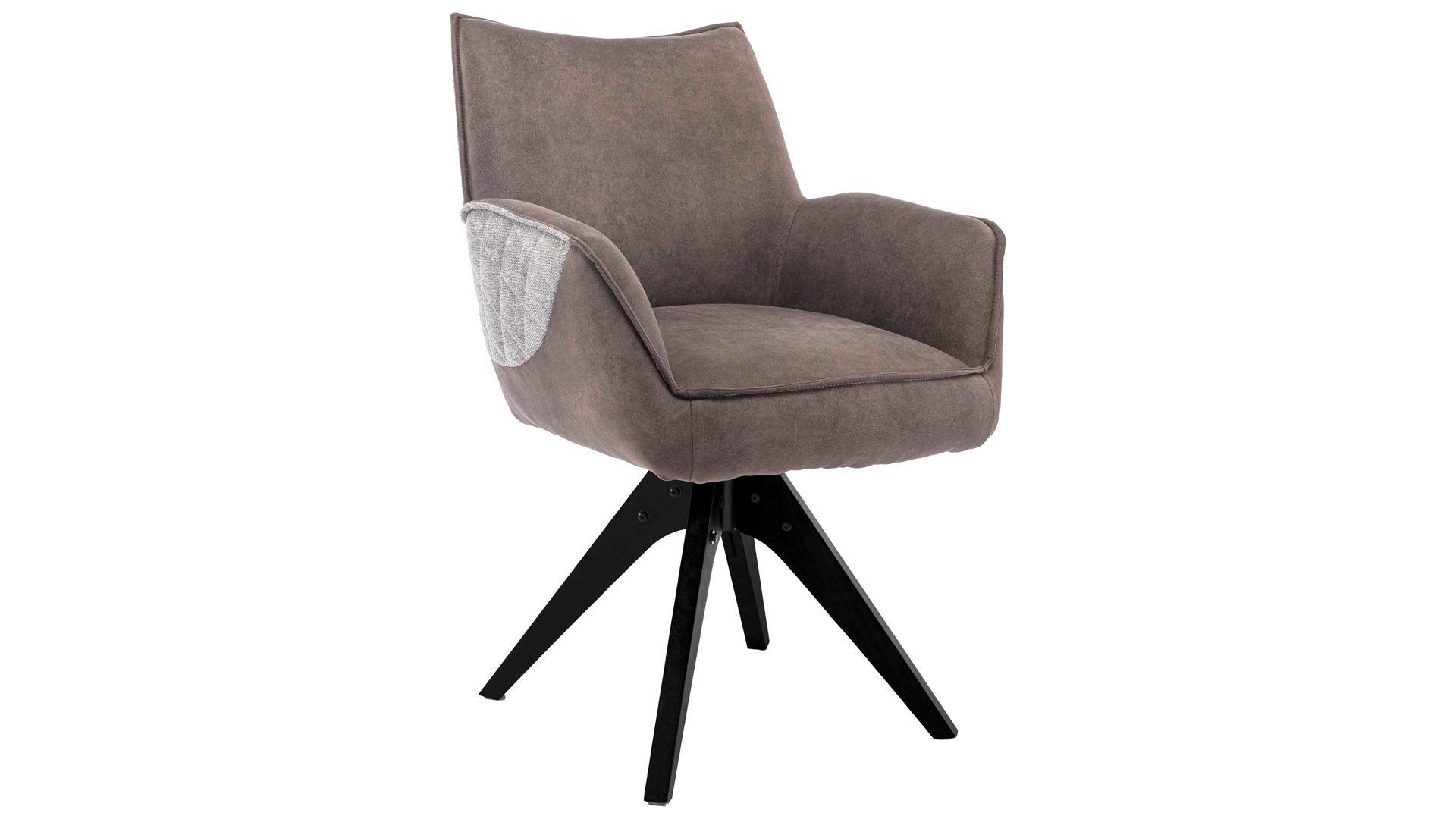brauner Stoffbezug im Antikleder-Look, kombiniert mit beige-braun meliertem Stoffbezug mit Rautensteppung und mattschwarzem Metall