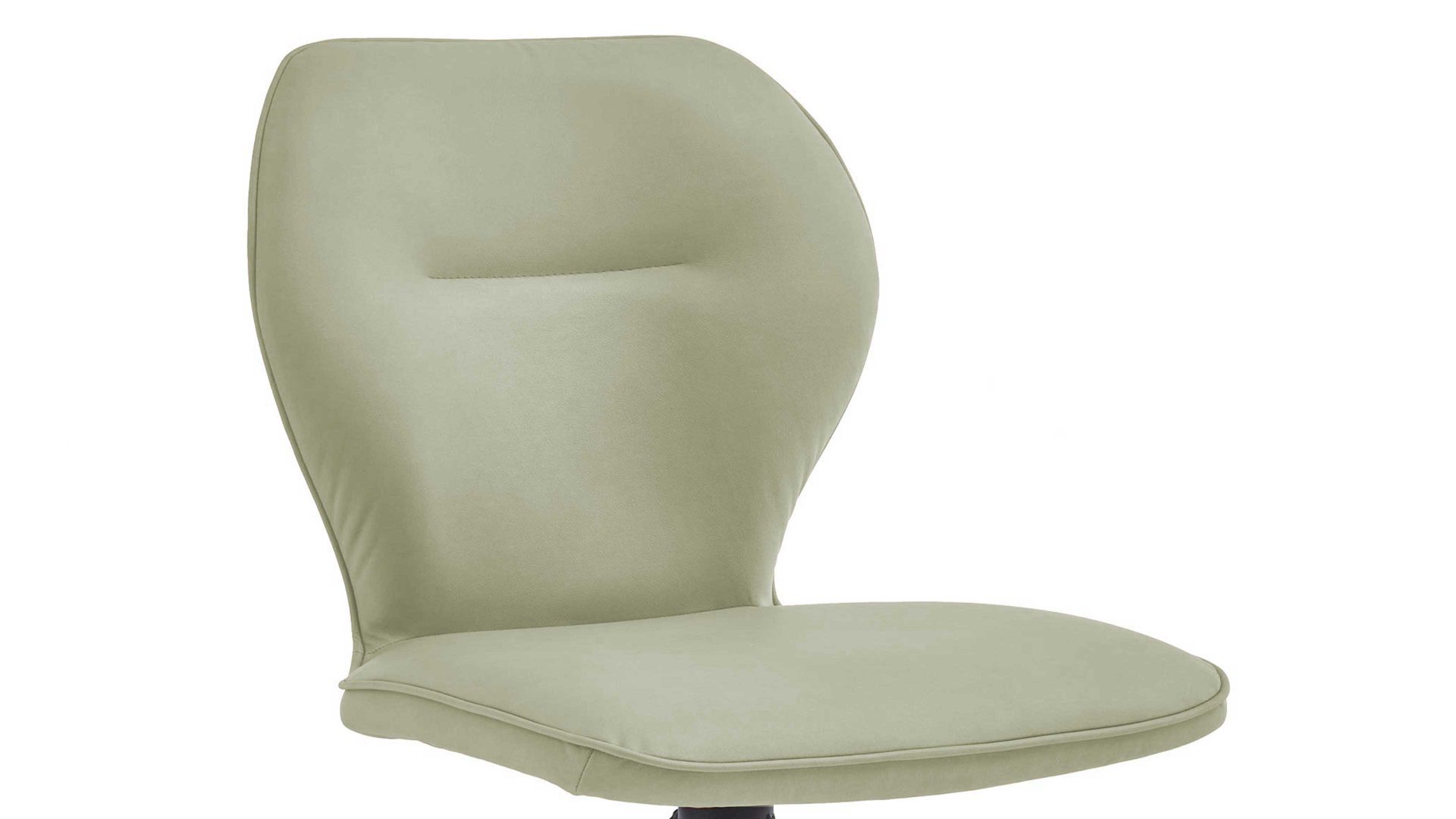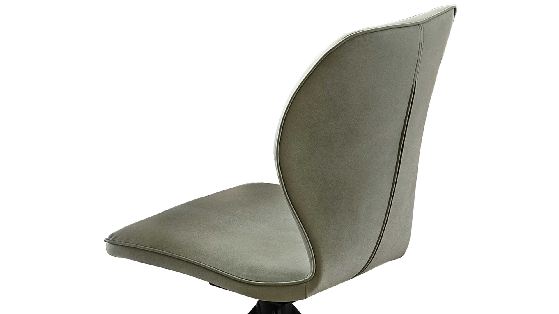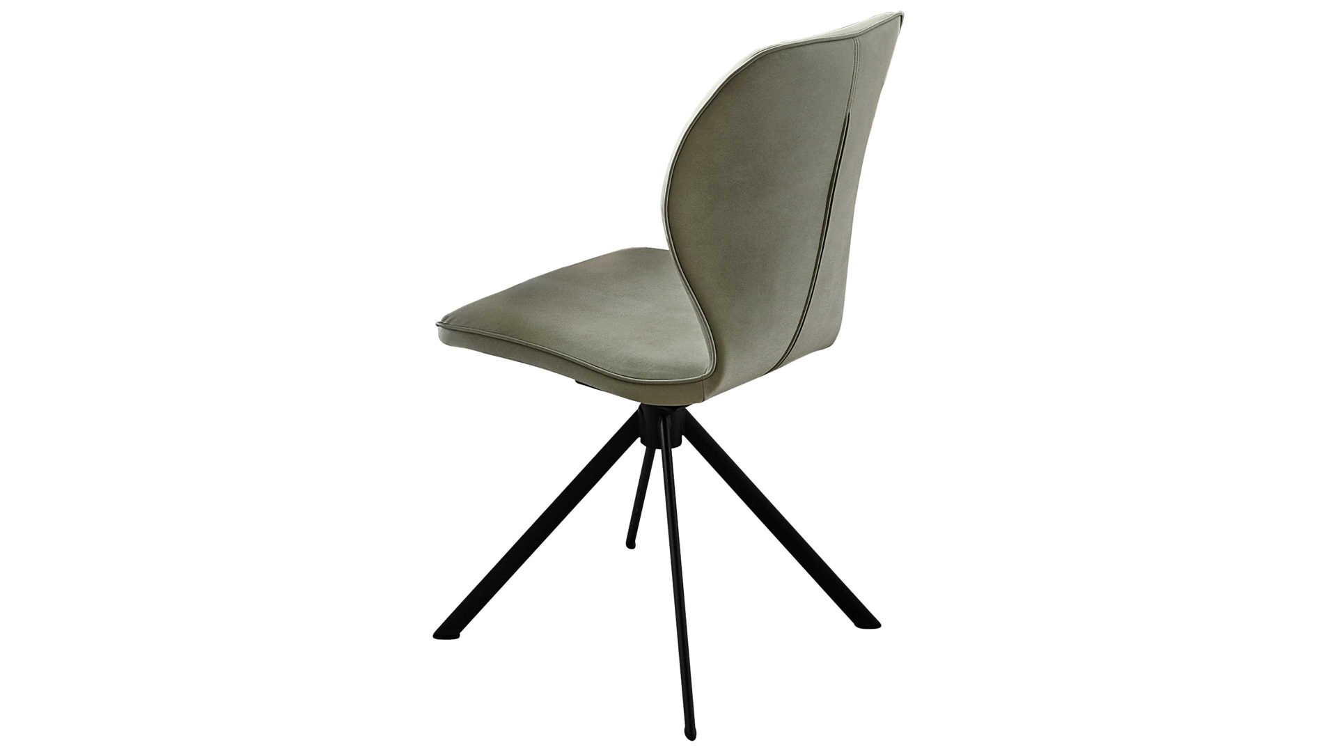 Er kombiniert ein mattschwarz lackiertes Stativgestell aus robustem Eisen mit einem lindgrünen Mikrofaserbezug in Lederoptik und fügt sich in verschiedene Wohnstile harmonisch ein. Zu den optischen Highlights des Esszimmerstuhls gehört neben der Formensprache und den perfekt aufeinander abgestimmten Farben der markante Quereinzug im Rücken. Praktisch begeistern die Drehbarkeit um 180 Grad mit Rückholfunktion sowie die bodenschonenden Gleiter am Gestell.
