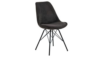 Er kombiniert ein mattschwarz lackiertes Stativgestell aus robustem Eisen mit einem graphitfarbene Mikrofaserbezug in Lederoptik und fügt sich in verschiedene Wohnstile harmonisch ein. Zu den optischen Highlights des Esszimmerstuhls gehört neben der Formensprache und den perfekt aufeinander abgestimmten Farben der markante Quereinzug im Rücken.
