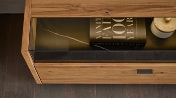 Als klassischer TV-Unterschrank oder elegantes Hifi-Lowboard bietet dieses Möbelstück vielfältige Einsatzmöglichkeiten. Zwei großzügige Schubladen und zwei Fächer hinter Glas schaffen Stauraum für elektronische Geräte, Zubehör oder Wohnaccessoires – übersichtlich, geschützt und gleichzeitig ansprechend präsentiert. Ob als Medienmöbel, TV-Tisch oder Teil einer Wohnwand – das Lowboard überzeugt durch seine klare Struktur und die gelungene Verbindung von Natürlichkeit und moderner Eleganz.