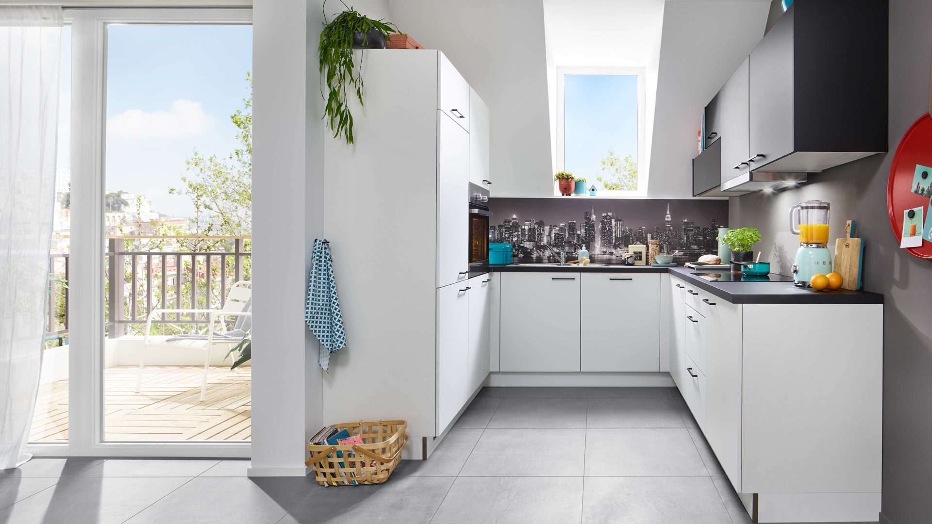supermatte weiße Lacklaminatfronten und schwarze Arbeitsplatten mit Steinstruktur
