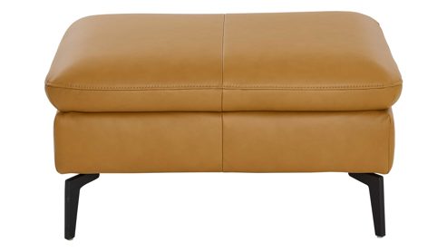 kurkumafarbener Semi-Anilin-Lederbezug mit softem Griff und feiner Lederstruktur, kombiniert mit mattschwarzen Metallfüßen