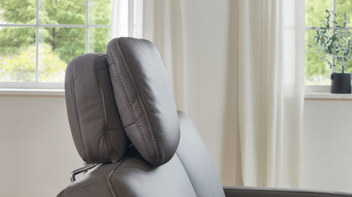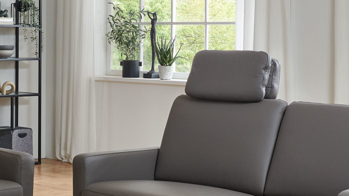 die Kopfstütze wird in die Kopfstützvorrichtung an der Rückenlehne des Sofas eingesteckt und lässt sich dann in der Höhe und in der Neigung manuell verstellen