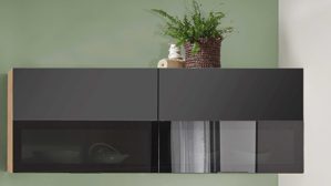 supermattes Grafit und Eiche Aviva-Nachbildung, kombiniert schwarzem Akzentglas, edelstahlfarbenen Bügelgriffen und Arbeitsplatte in Evoke Eiche-Nachbildung