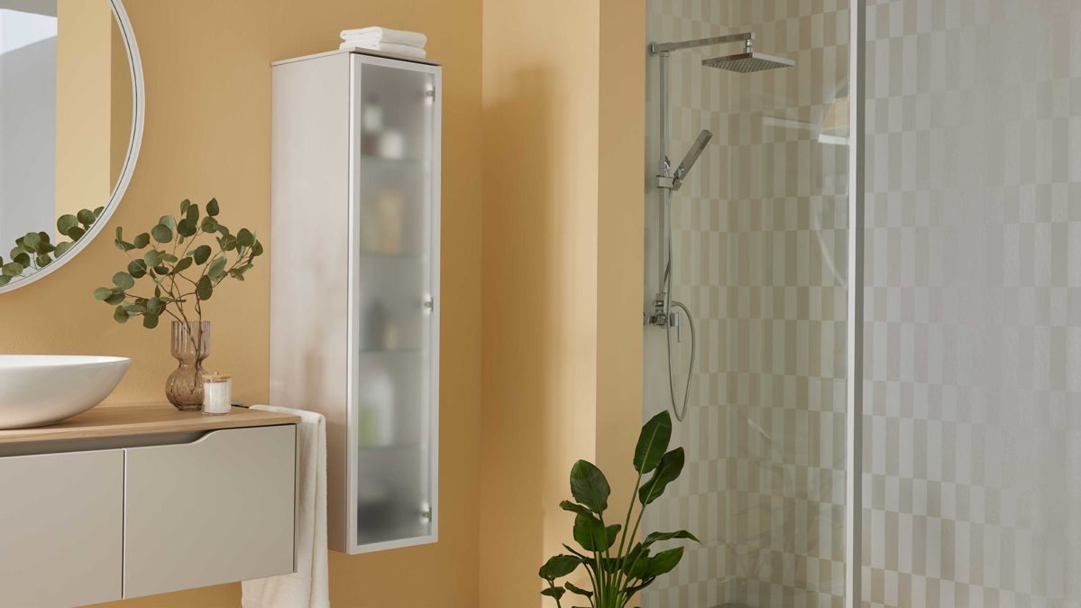 Die grifflos gestaltete Rahmentür öffnest du ganz bequem über die push-to-open-Funktion mit Öffnungsunterstützung – elegant, schlicht und funktional. Im Inneren sorgen vier höhenverstellbare Klarglasböden für flexible Ordnung, damit du Pflegeprodukte, Handtücher und Accessoires übersichtlich verstauen kannst. Der passende Abdeckboden setzt auf der Oberseite einen natürlichen Akzent und rundet das Gesamtbild stilvoll ab.