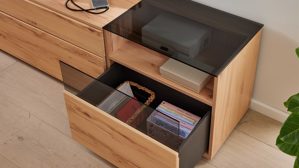 Auf Wunsch stattest du deine Wohnwand mit einer LED-Glasfachbeleuchtung für stimmungsvolle Lichtakzente, einem Wireless Charger für kabelloses Laden oder einer Einbausteckdose Backflip für praktische Stromanschlüsse direkt am Möbel aus. So wird deine Wohnwand nicht nur schön, sondern auch smart.
