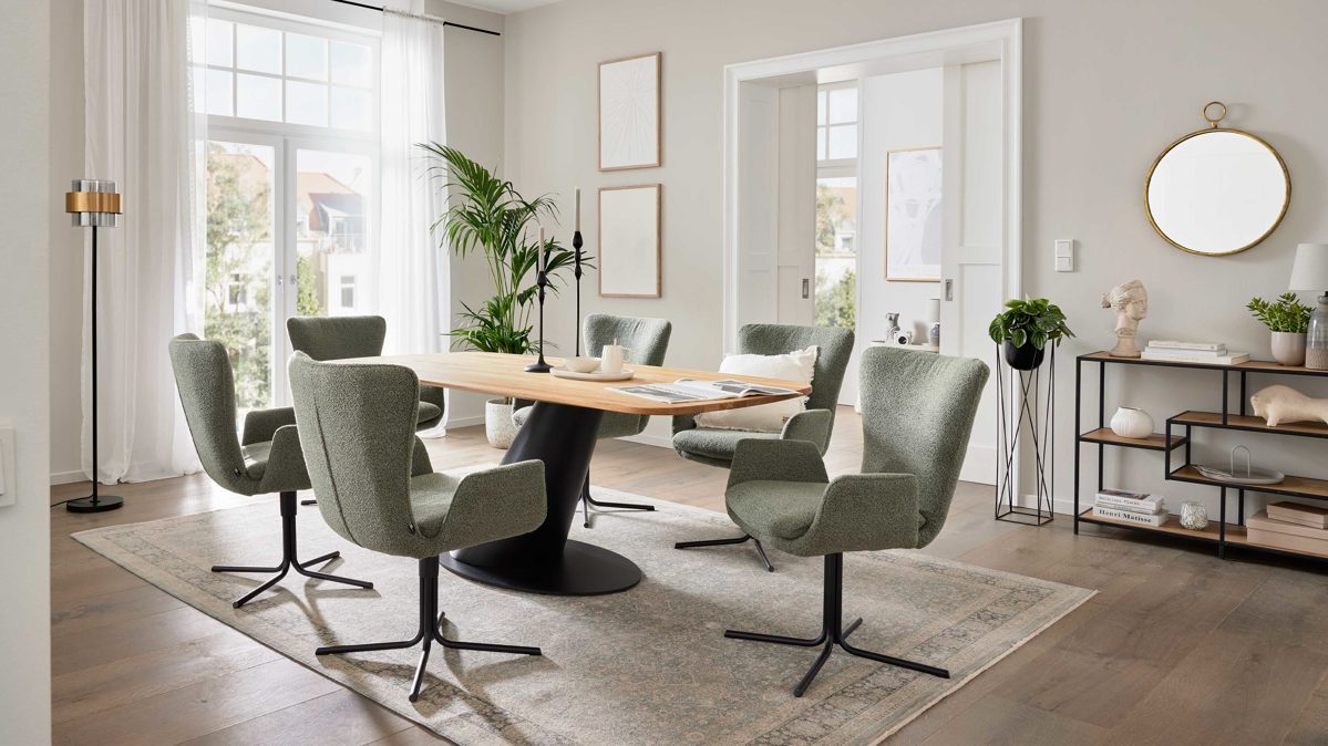 Die sechs Armlehnstühle ergänzen den Tisch perfekt. Ihre ergonomisch geformte Skulptur-Sitzschale mit festem Sitzkissen sorgt für ein angenehm umschlossenes Sitzgefühl. Die integrierte 360°-Drehfunktion mit Rückholmechanik macht den Alltag besonders komfortabel: Du drehst dich einfach vom Tisch weg, stehst auf – und der Stuhl findet sanft in seine Ausgangsposition zurück.