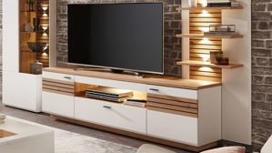 • Die Abbildung zeigt ein Wohnbeispiel, welches auch Dekoration enthält. Im Lieferumfang enthalten ein TV-Lowboard ohne Beleuchtung.