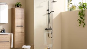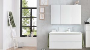 Die Abbildung zeigt ein Wohnbeispiel, welches auch Dekoration sowie separat erhältliches Zubehör enthält. Im Lieferumfang enthalten sind zwei Hängeschränke, ein Spiegelschrank ohne Aufsatzleuchte und Steckdose, ein Waschbecken, eine schwarze Armatur, zwei schwarze Handtuchhalter und ein Waschbeckenunterschrank.